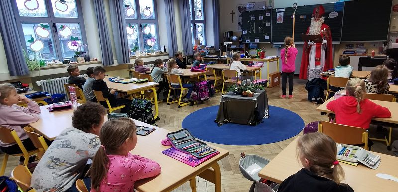 Der Nikolausbesuch in den Klassen 1a und 1b faszinierte die Kinder.