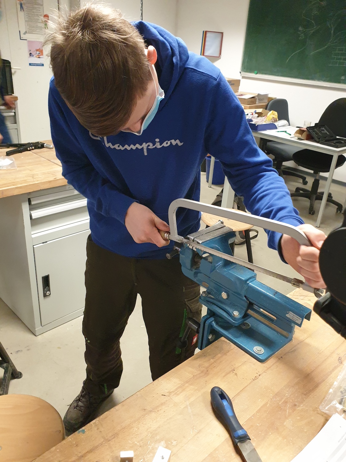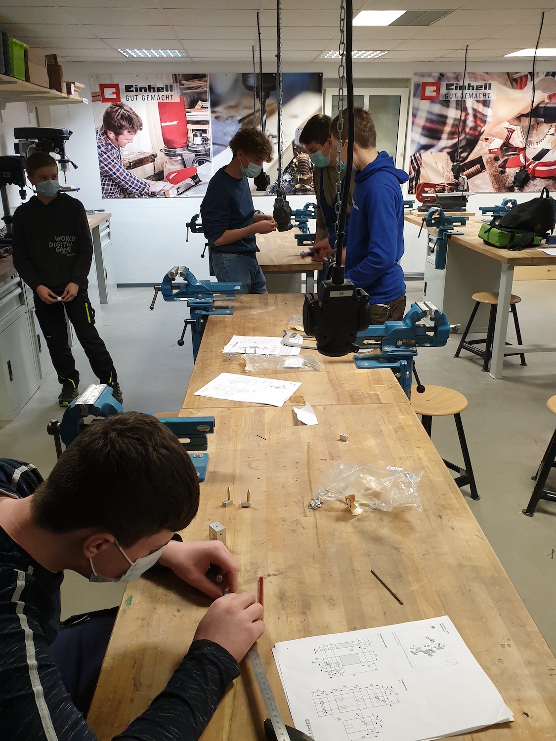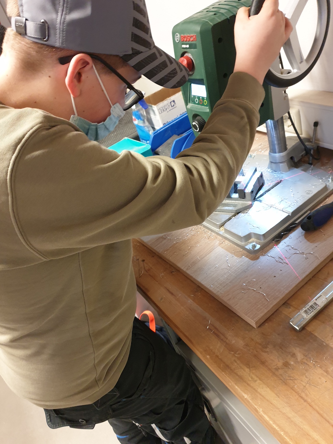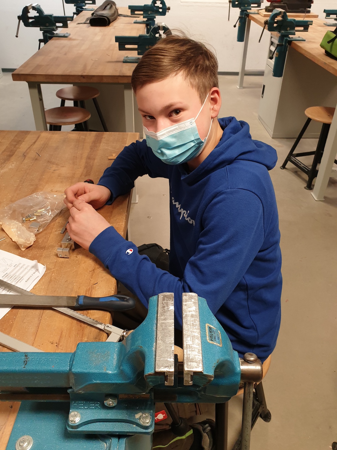 Die 8. Klasse nahm an der berufsorientierenden Maßnahme "Talente entwickeln" des bfz Landau teil. Die Schülerinnen und Schüler erhielten Einblicke in wirtschaftliche, handwerkliche und soziale Berufsfelder. Wie auf den Bildern zu sehen ist, versuchten sie sich unter anderem bei der Metallbearbeitung und verschiedenen wirtschaftlichen Tätigkeiten, z. B. der Führung eines Kassenbuches.
