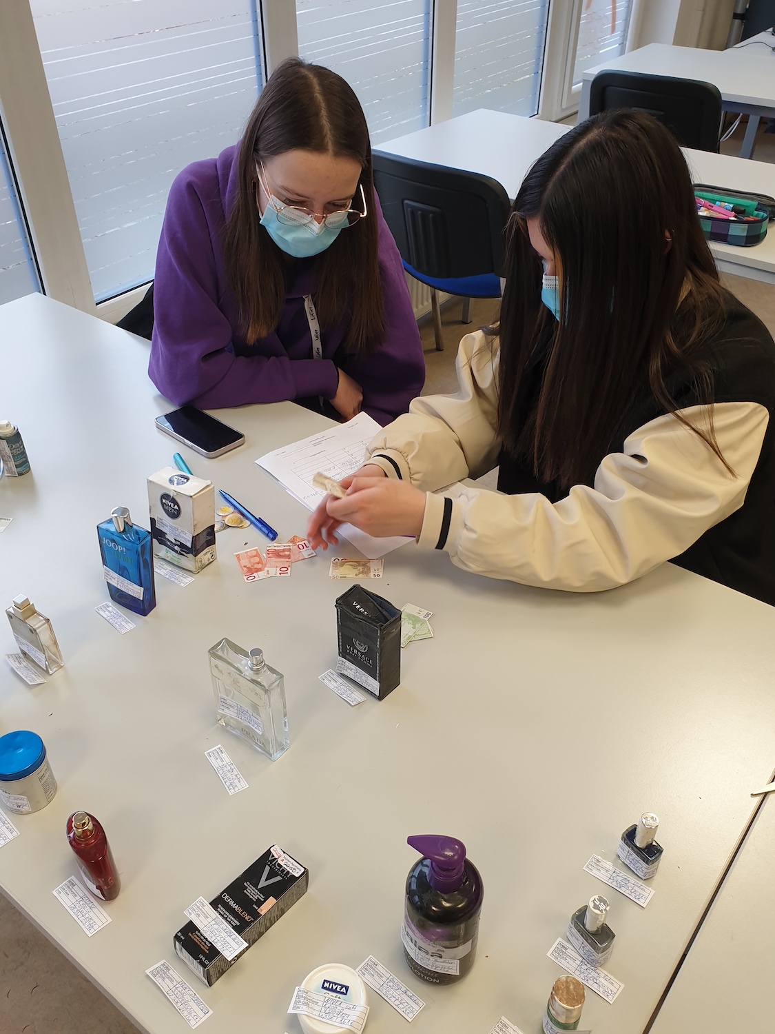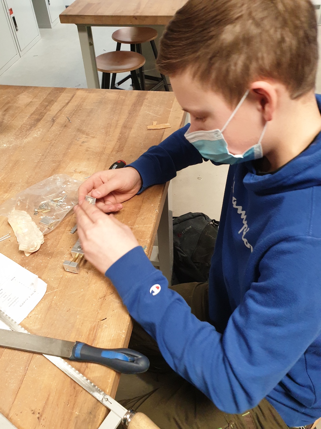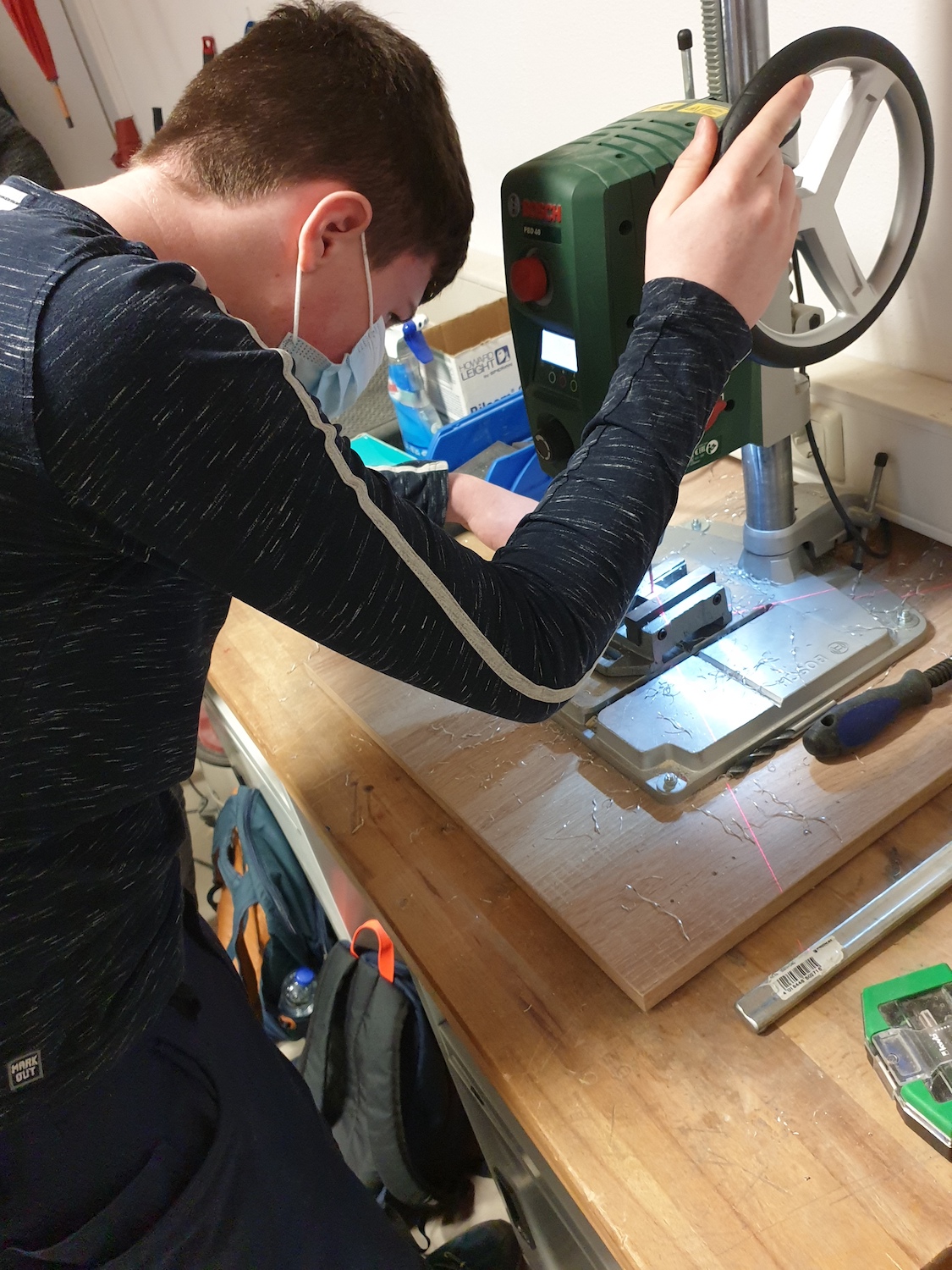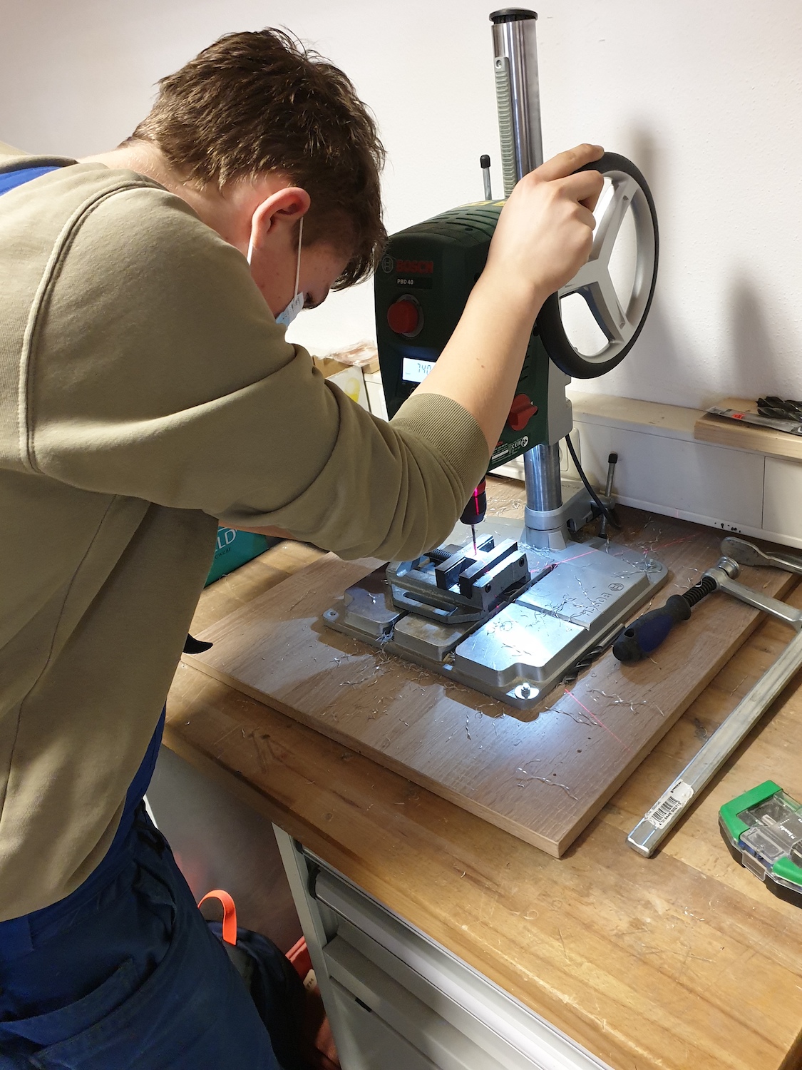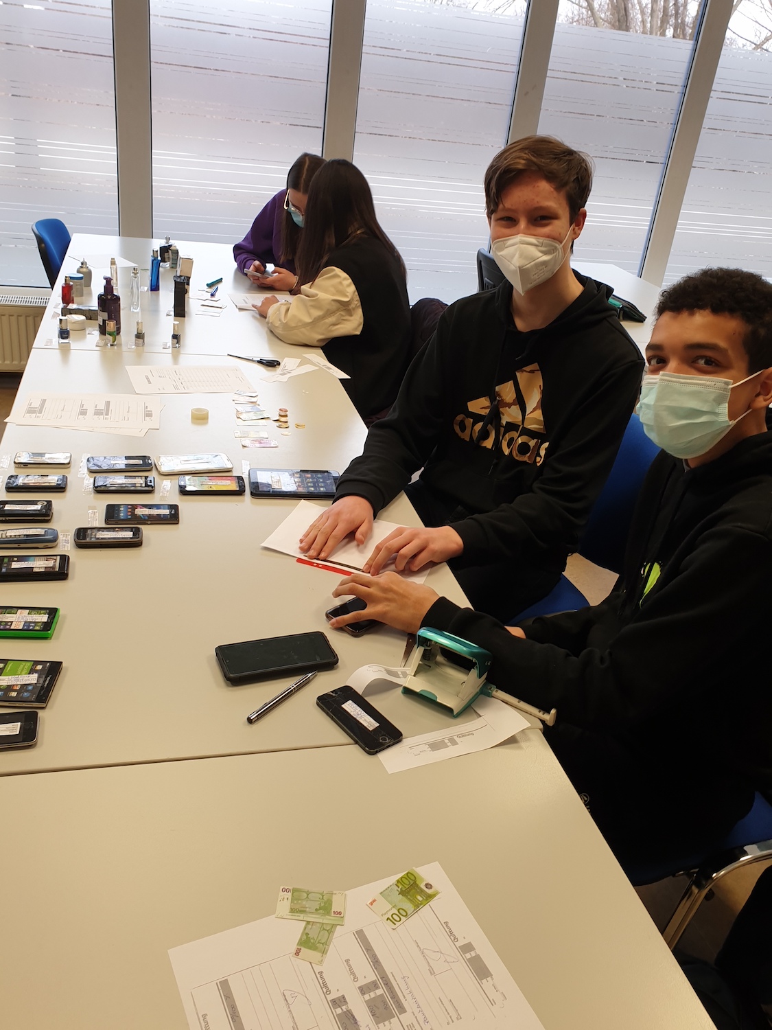 Die 8. Klasse nahm an der berufsorientierenden Maßnahme "Talente entwickeln" des bfz Landau teil. Die Schülerinnen und Schüler erhielten Einblicke in wirtschaftliche, handwerkliche und soziale Berufsfelder. Wie auf den Bildern zu sehen ist, versuchten sie sich unter anderem bei der Metallbearbeitung und verschiedenen wirtschaftlichen Tätigkeiten, z. B. der Führung eines Kassenbuches.